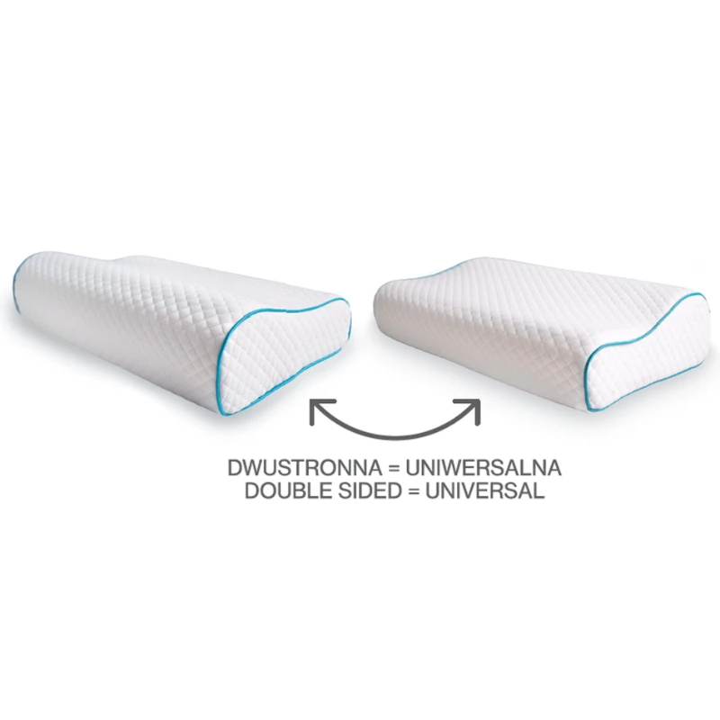 Profilowana poduszka ortopedyczna BETA Sanipur z pianki termoplastycznej. Dwustronna konstrukcja i wkładka regulująca wysokość zapewniają zdrowe podparcie szyi i komfortowy sen.
