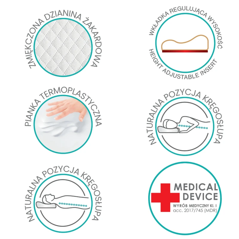 Rdzeń z pianki termoplastycznej reaguje na temperaturę ciała, równomiernie rozkłada nacisk i redukuje napięcia mięśniowe w obrębie karku oraz barków. Profilowany kształt wspiera naturalną krzywiznę szyi, sprzyjając regeneracji i poprawie jakości snu.