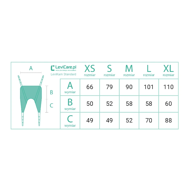 Kamizelka LeviKam Standard współpracuje z podnośnikami dla osób z niepełnosprawnościami, m.in. z podnośnikiem transportowym Levicare Q140. Charakteryzuje się wysoką jakością wykonania i przemyślanym kształtem. Wykonana jest z wytrzymałej, bezpiecznej siatki poliestrowej, która doskonale przepuszcza wodę i szybko schnie. Kamizelka LeviKam Standard umożliwia transport użytkownika w pozycji siedzącej zapewniając podparcie dla pleców. Pozycję podopiecznego można dopasowywać do potrzeb dzięki 4­-punktowemu, regulowanemu zawieszeniu. Wszyty uchwyt manewrowy pozwala na obracanie użytkownika w pozycji wiszącej.