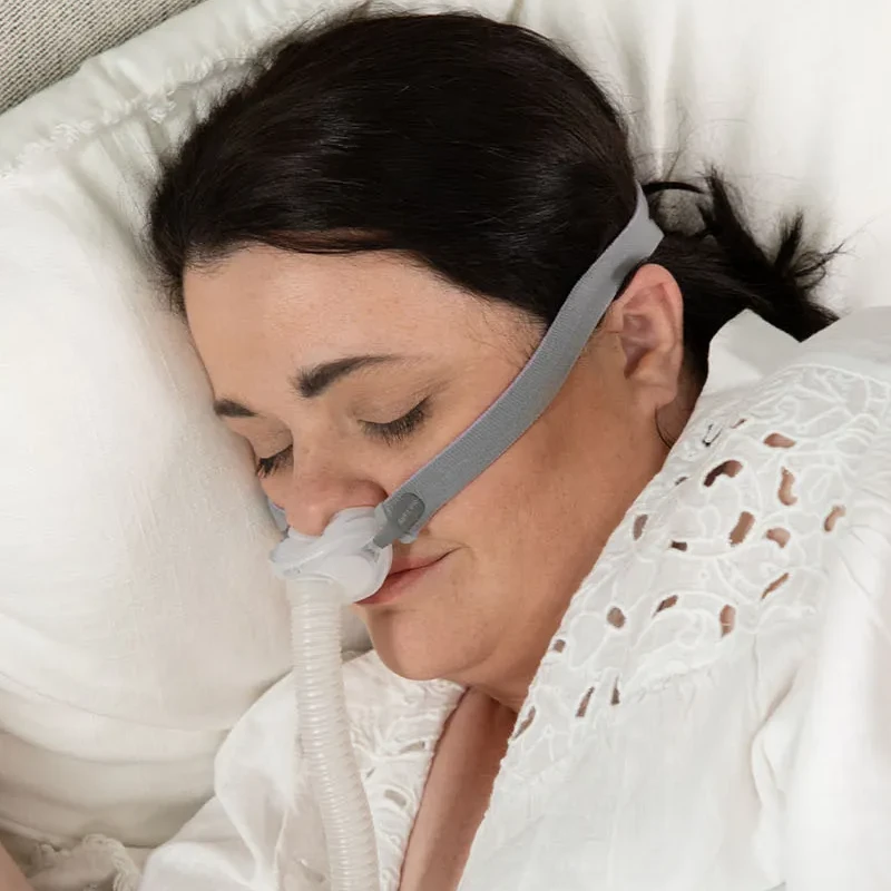 Wkładki donosowe w trzech rozmiarach (S, M, L – wszystkie w zestawie) zapewniają stabilność i szczelność przez całą noc. Elastyczne, regulowane mocowanie umożliwia łatwe dopasowanie maski do kształtu głowy.