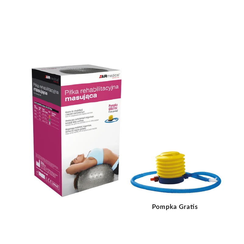 Piłka rehabilitacyjna masująca przeznaczona jest do korygowania wad postawy, w terapii mającej na celu poprawę kondycji i koordynacji ruchowej, wzmocnienia mięśni grzbietu, zwiększenia ruchomości stawów oraz w schorzeniach neurologicznych. Doskonała dla osób chcących zachować sprawność fizyczną dzięki treningowi ogólnorozwojowemu. Dzięki miękkim, masującym wypustkom na całej powierzchni stymuluje strefy reflektoryczne (receptory) na skórze działając pobudzająco. Idealna do rehabilitacji i ćwiczeń równoważnych (przykład ćwiczeń w zestawie) Idealna przy schorzeniach kręgosłupa, koryguje wady postawy Wspomaga mobilność kręgosłupa, wzmacnia mięśnie grzbietu