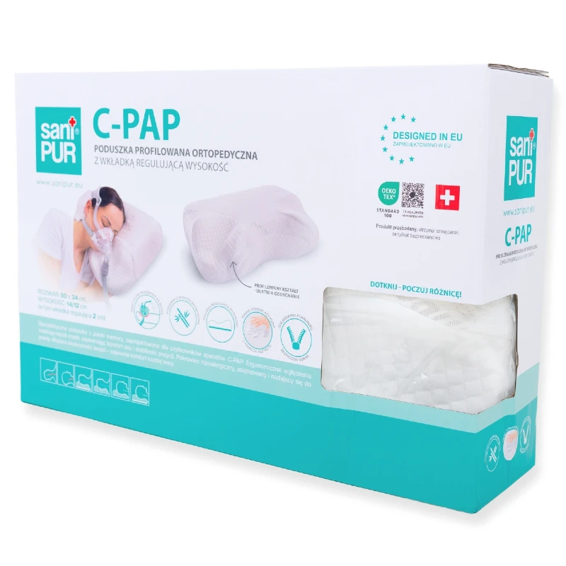 Poduszka ortopedyczna C-PAP Sanipur z pianki memory i wkładką regulującą 2 cm. Redukuje nacisk maski CPAP, poprawia szczelność i komfort terapii.