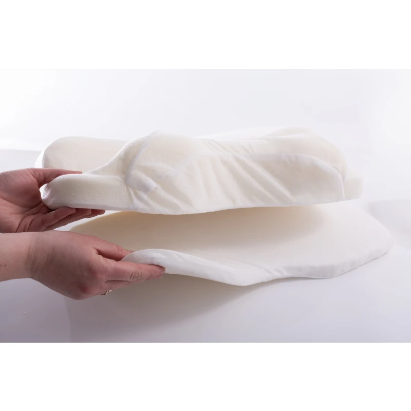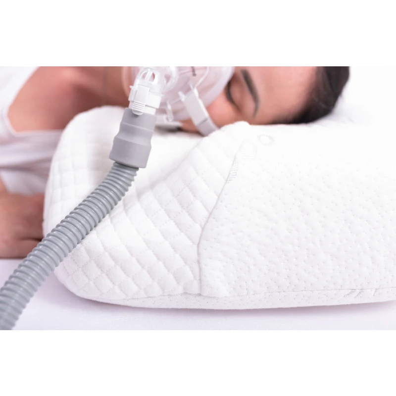 Specjalnie zaprojektowane wgłębienia boczne skutecznie redukują nacisk maski CPAP na twarz, ograniczają jej przesuwanie się w trakcie snu i pomagają zachować prawidłową szczelność układu terapeutycznego. Pianka typu memory foam dopasowuje się do kształtu głowy i szyi pod wpływem ciepła ciała, stabilizując odcinek szyjny kręgosłupa i zwiększając komfort każdej nocy.