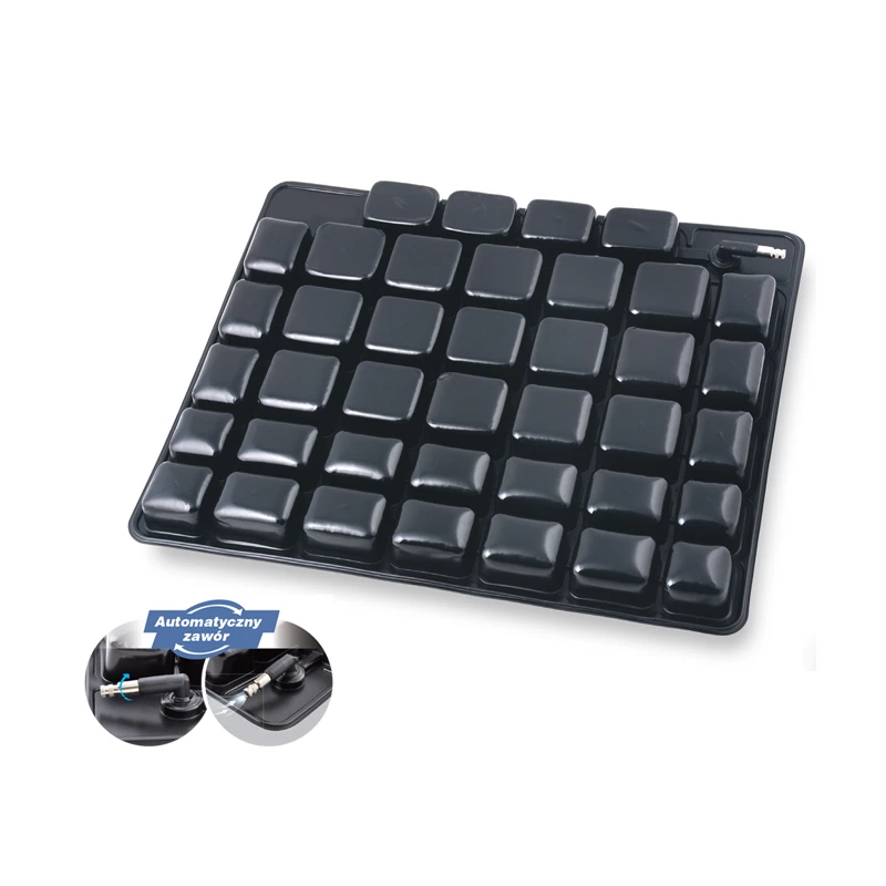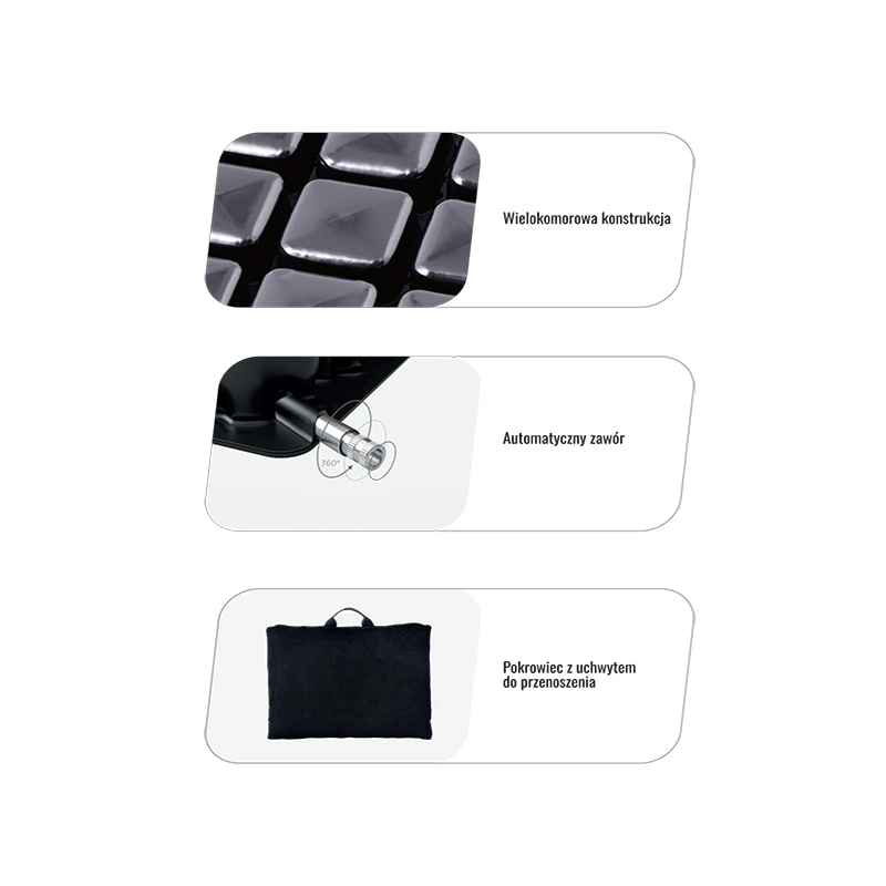 Specjalna wielokomorowa konstrukcja oraz możliwość zmiany twardości poprzez dopompowanie lub upuszczenie powietrza gwarantują wysoki komfort użytkowania. Zastosowanie automatycznego zaworu umożliwia w dowolnej chwili zmianę twardości poduszki w zależności od preferencji użytkownika. Wykonana jest z wysokiej jakości tworzywa odpornego na nacisk. Niezależne komory połączone są w jeden system powietrzny, dzięki czemu umożliwią balans ciała. Nacisk na wybrną komorę, powoduje wzrost ciśnienia w sąsiedniej komorze i tym samym odciążenie poszczególnych części ciała. Dzięki zastosowaniu odpowiedniej technologii zgrzewania poduszka nie rozszczelnia się.