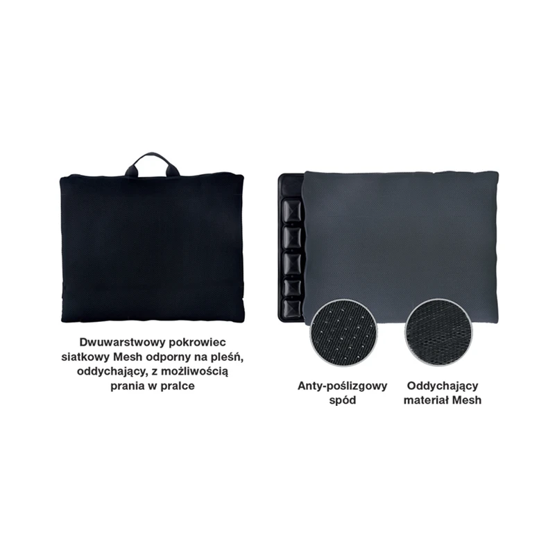 Poduszka wyposażona w przewiewny pokrowiec zapinanym na suwak, wykonany z materiału siatkowego Mesh, z anty-poślizgowym spodem. Wygodny uchwyt umożliwia łatwe jej przenoszenie. Wyposażona ponadto w dodatkowe rzepy umożliwiające trwałe zamocowanie poduszki np. na wózku inwalidzkim.