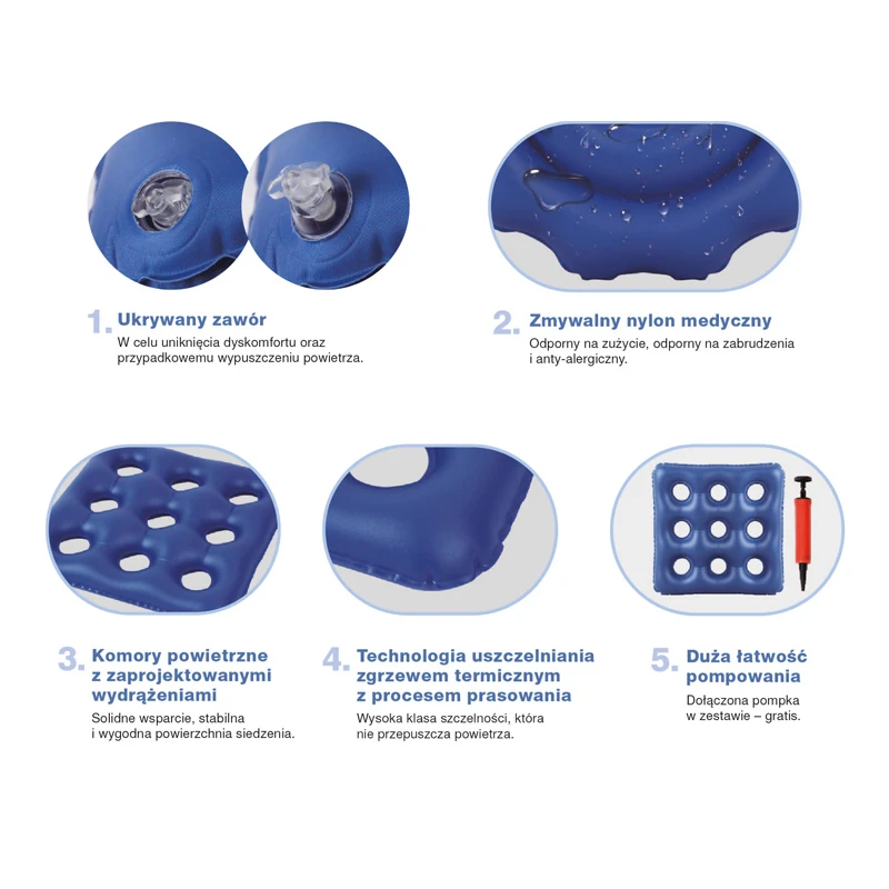 Unikalny kształt oraz możliwość zmiany twardości poprzez dopompowanie lub upuszczenie powietrza gwarantują wysoki komfort użytkowania. Wykonana jest z wysokiej jakości zmywalnego anty-alergicznego nylonu medycznego odpornego na ścieranie oraz nacisk. Dzięki zastosowaniu odpowiedniej technologii zgrzewania poduszka nie rozszczelnień się. Chowany zawór zapobiega przypadkowemu wypuszczeniu powietrza z poduszki w trakcie użytkowania.