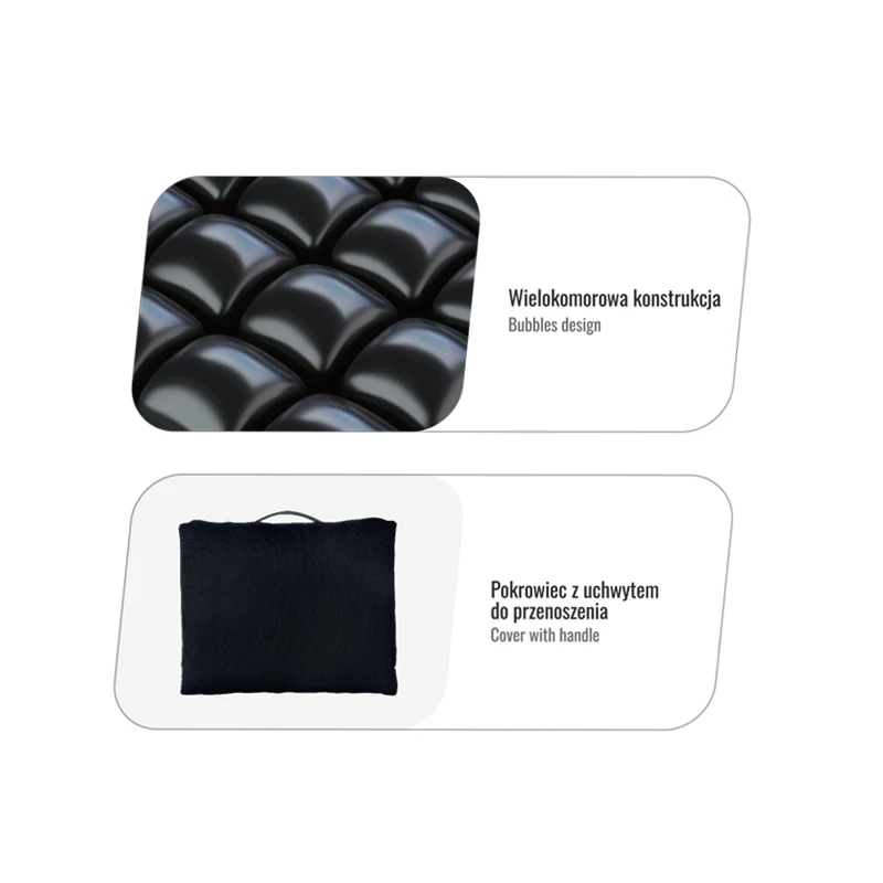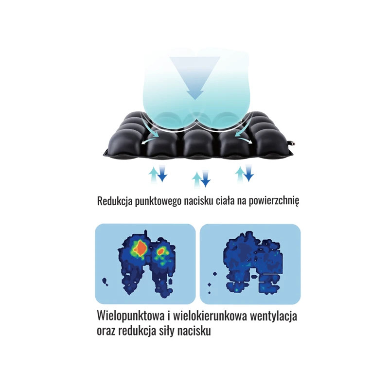 Specjalna wielokomorowa konstrukcja oraz możliwość zmiany twardości poprzez dopompowanie lub upuszczenie powietrza gwarantują wysoki komfort użytkowania. Zastosowanie automatycznego zaworu umożliwia w dowolnej chwili zmianę twardości poduszki w zależności od preferencji użytkownika. Wykonana jest z wysokiej jakości tworzywa odpornego na nacisk. Niezależne komory połączone są w jeden system powietrzny, dzięki czemu umożliwią balans ciała. Nacisk na wybraną komorę, powoduje wzrost ciśnienia w sąsiedniej komorze i tym samym odciążenie poszczególnych części ciała. Dzięki zastosowaniu odpowiedniej technologii zgrzewania poduszka nie rozszczelnia się.