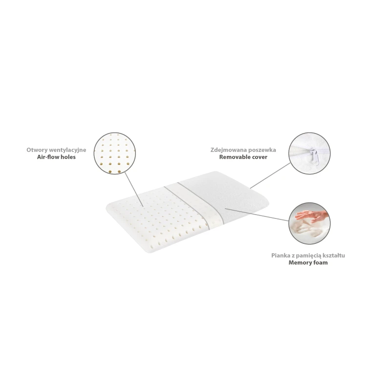 Poduszka to wyrób medyczny stworzony z lekkich i wytrzymałych materiałów, opracowany w oparciu o nowoczesne założenia projektowe. Pianka memory pod wpływem temperatury ciała idealnie dopasowuje się do jego kształtów, zwiększając tym samym powierzchnię podparcia. Poduszka to obok zajęć fizjoterapeutycznych i fizycznych uznany, podstawowy środek wpływający na zdrowie w dysfunkcjach kręgosłupa szyjnego. Poduszka jest przyjazna dla alergików, dzięki piance z pamięcią kształtu, która nie sprzyja rozwojowi roztoczy. Niskie wyprofilowanie poduszki pomaga utrzymać głowę, szyję i kręgosłup dziecka w jednej linii i odciąża rosnące ciało. Poduszka idealna do łóżeczka lub łóżka rodzica.