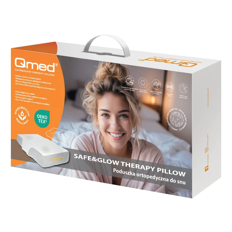 Qmed Safe & Glow Therapy Pillow to innowacyjna poduszka ortopedyczna, zaprojektowana z myślą o osobach, które chcą jednocześnie zadbać o zdrowy sen, kręgosłup szyjny oraz kondycję skóry twarzy. Jej unikalna konstrukcja minimalizuje nacisk na wrażliwe obszary twarzy, pomagając ograniczyć powstawanie tzw. zmarszczek sennych, a jednocześnie zapewnia stabilne, ergonomiczne podparcie odcinka szyjnego.