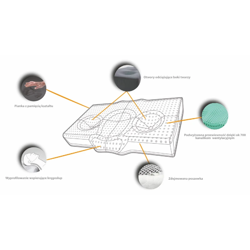 Pianka termoelastyczna reaguje na temperaturę ciała i delikatnie dopasowuje się do kształtu głowy oraz szyi. Dzięki temu zwiększa powierzchnię podparcia i zmniejsza nacisk na newralgiczne struktury mięśniowo-więzadłowe. Jednocześnie otwarta strefa twarzowa pozwala skórze odpocząć od ucisku, co ma szczególne znaczenie w profilaktyce zmarszczek oraz przy problemach dermatologicznych.