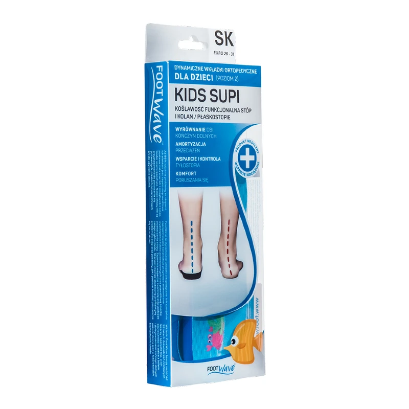 Dynamiczne wkładki ortopedyczne FootWave KIDS SUPI to bezpieczne medyczne wkładki zaprojektowane z myślą o dzieciach, u których stwierdzono koślawość stóp i kolan lub płaskostopie. Unikatowa budowa dynamicznych wkładek FootWave pomaga zmniejszyć ból stóp dziecka, szczególnie pięty, zwiększa stabilność i komfort poruszania się. Wkładki FootWave Kids mogą być stosowane zarówno jako leczenie koślawości i płaskostopia u dzieci, jak i profilaktycznie, aby zapobiegać powyższym dolegliwościom. Pomagają w okresie intensywnego wzrostu dziecka.